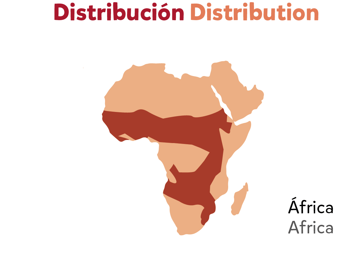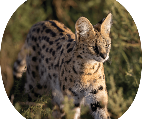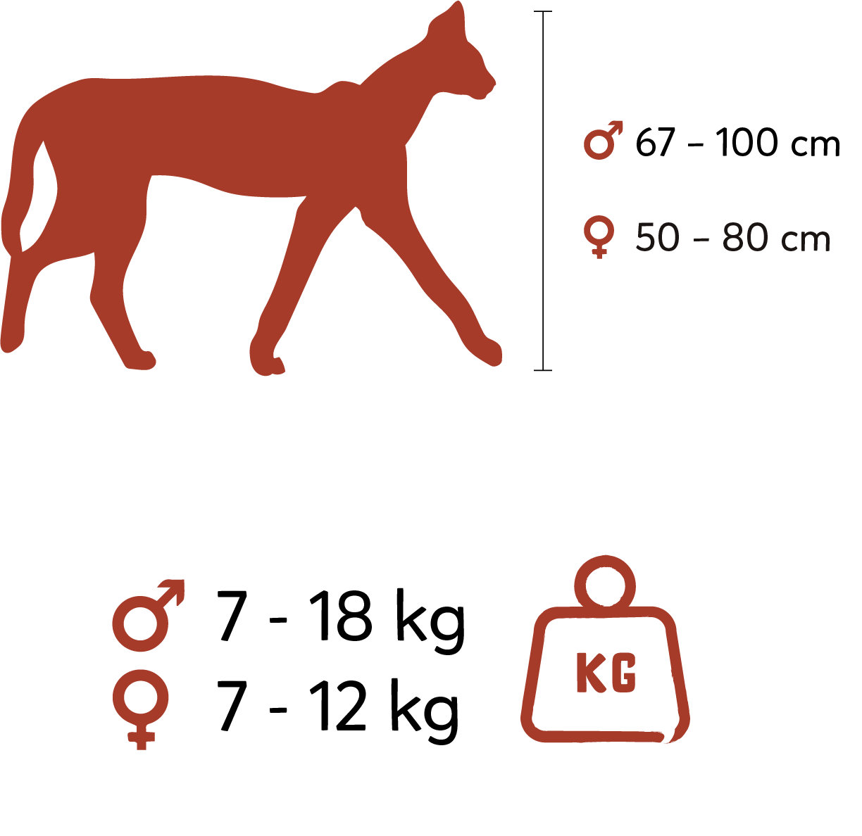 Mittelgroße Katze mit langem Hals und langen, schlanken Beinen, die es ihr ermöglichen, sehr schnell zu laufen. Sie hat ein orangefarbenes Fell mit schwarzen Streifen und Flecken, während ihr Bauch zart weiß ist. Dank ihrer großen Ohren verfügt sie über ein ausgezeichnetes Gehör.